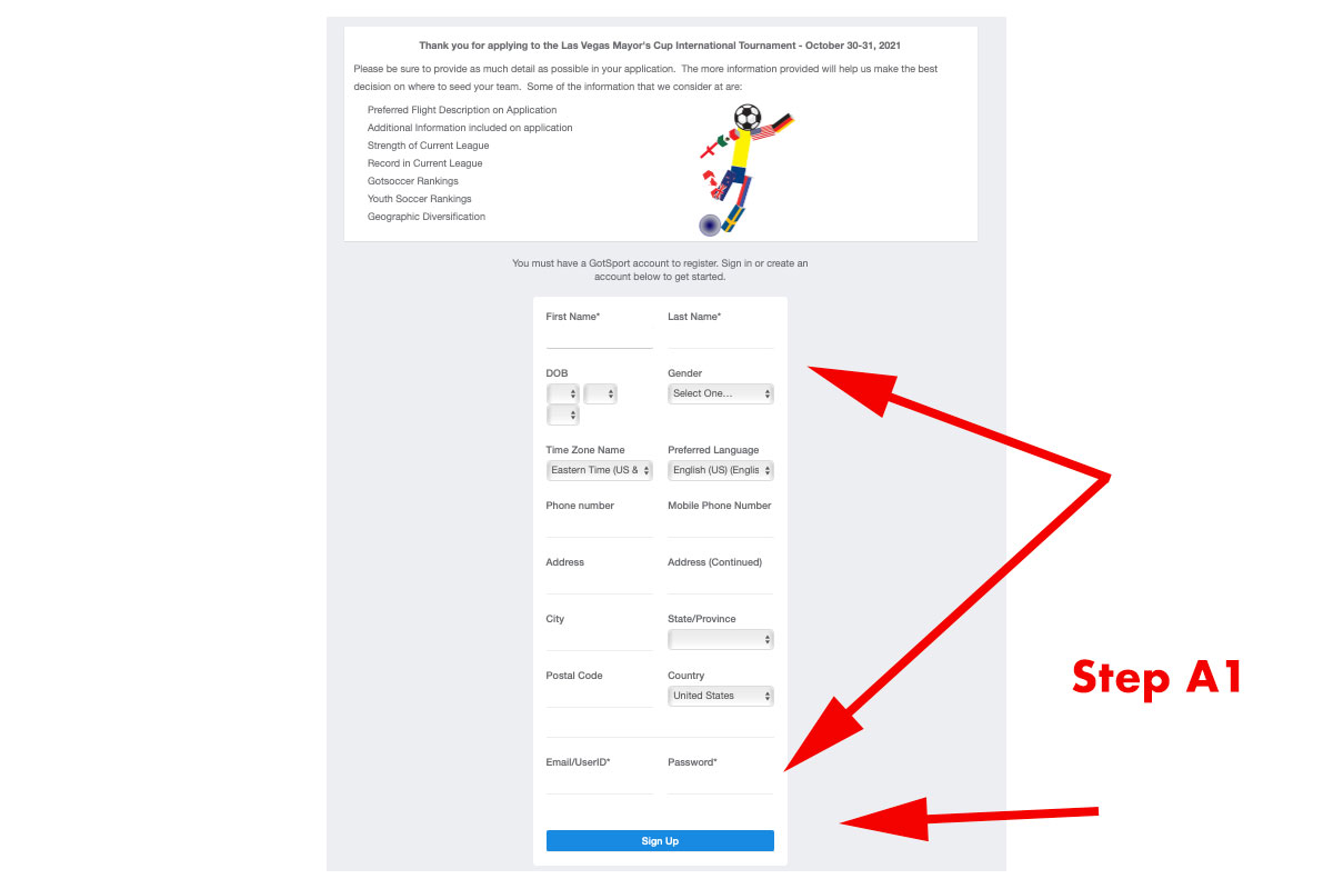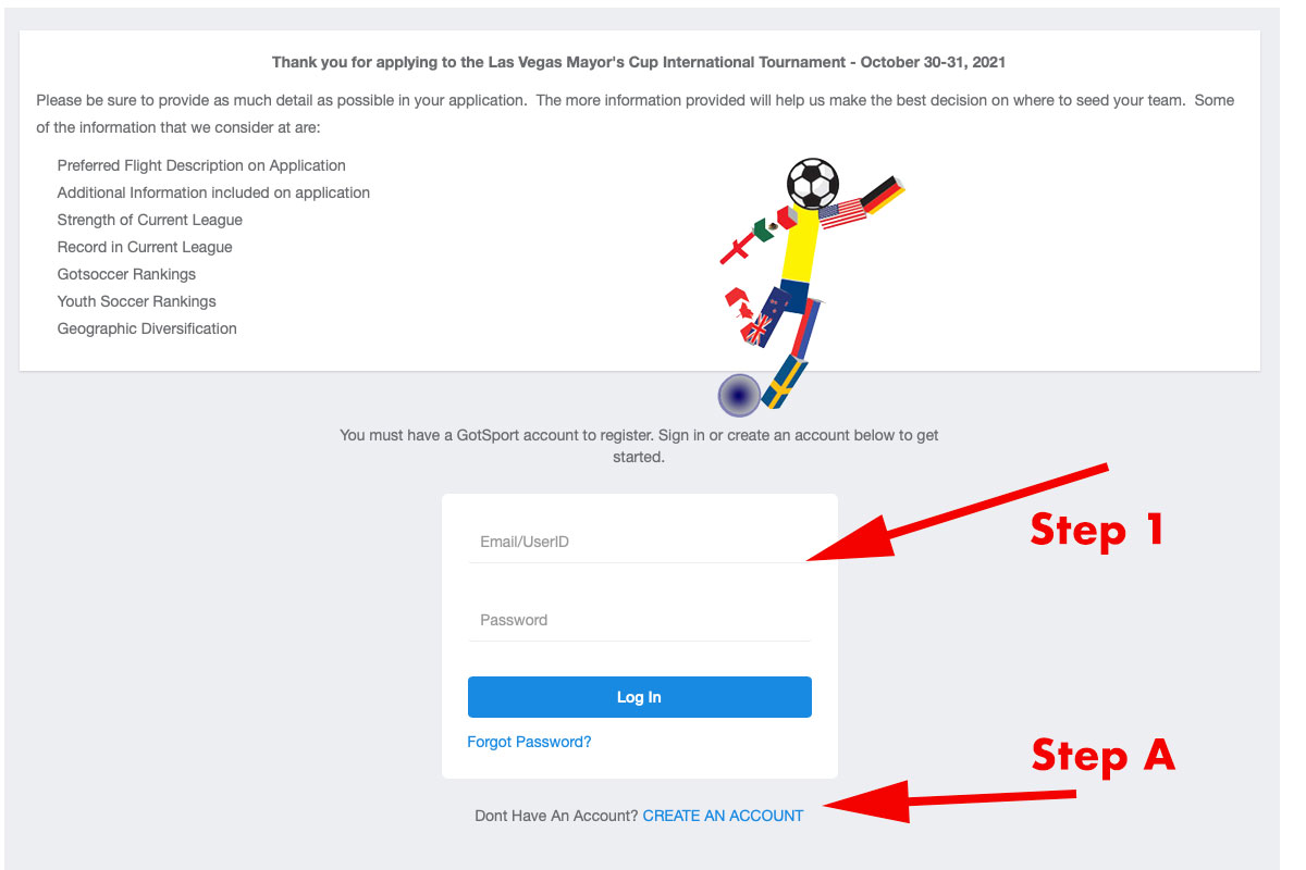 First step is to determine if you have a gotsport account. Many of Gotsoccer.com clubs have been transitioning to the new Gotsport platform. If your club has already migrated to the new platform, you should be able to start registering your team now (Skip to Step 1). If you are not part of Gotsport or an international team, you will probably need to start be creating an account and a team.