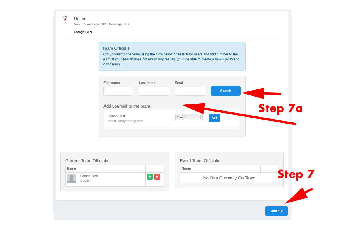 This is the point where you can add additional team officials to your registration. If you are adding another coach or team manager, and they have a Gotsport account, search their First, Last name and email address. If they are not there, you will be be able to create them.