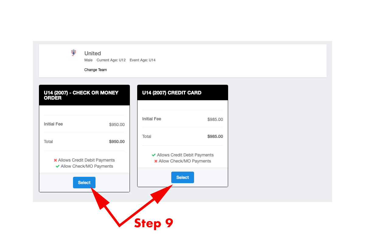 Now we come to the point where you can select what method of payment you would like to use, check or credit card. Remember that only teams that have paid in full will be considered for acceptance.