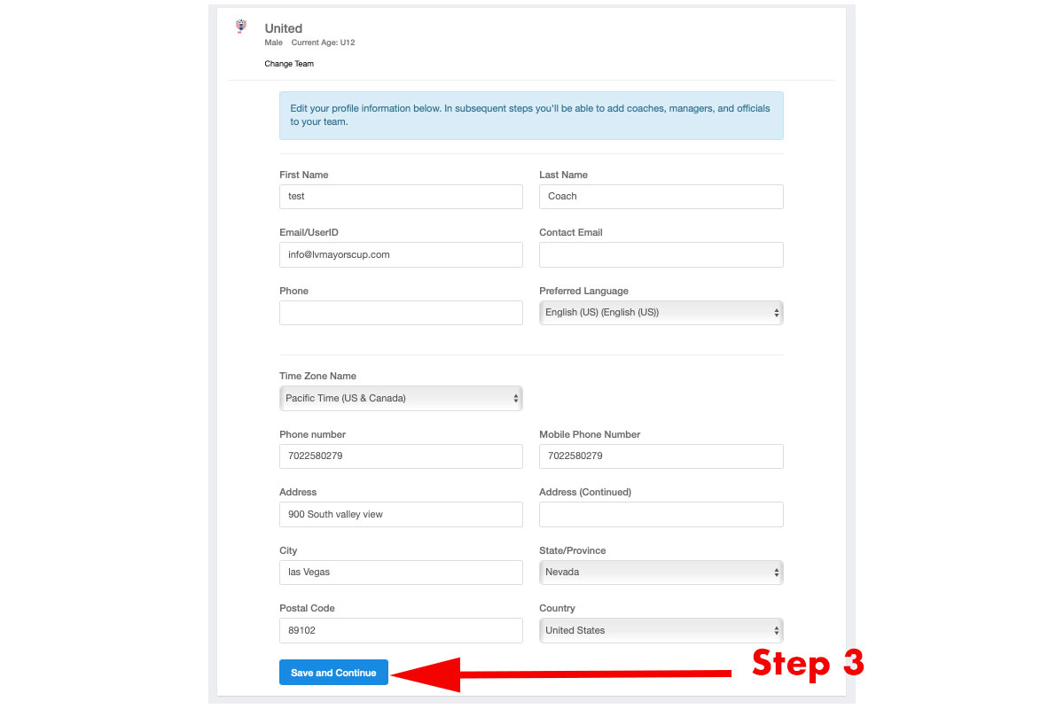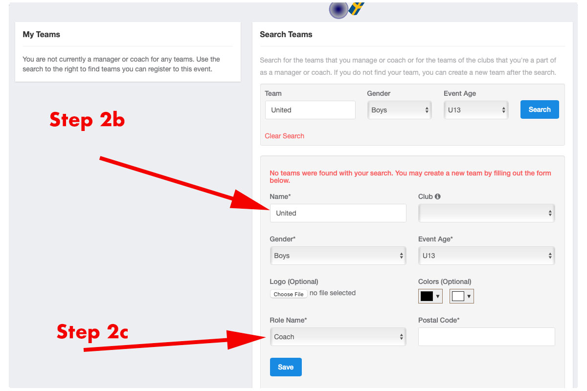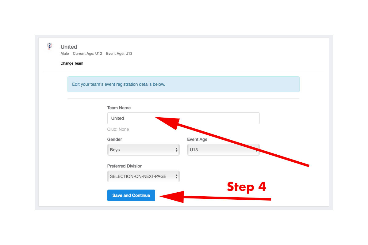Be sure to enter your team name only. Do not enter your club name, If you are not able to select a club name from the dropdown, get with your club administrator to have them create your team so that club can be listed.