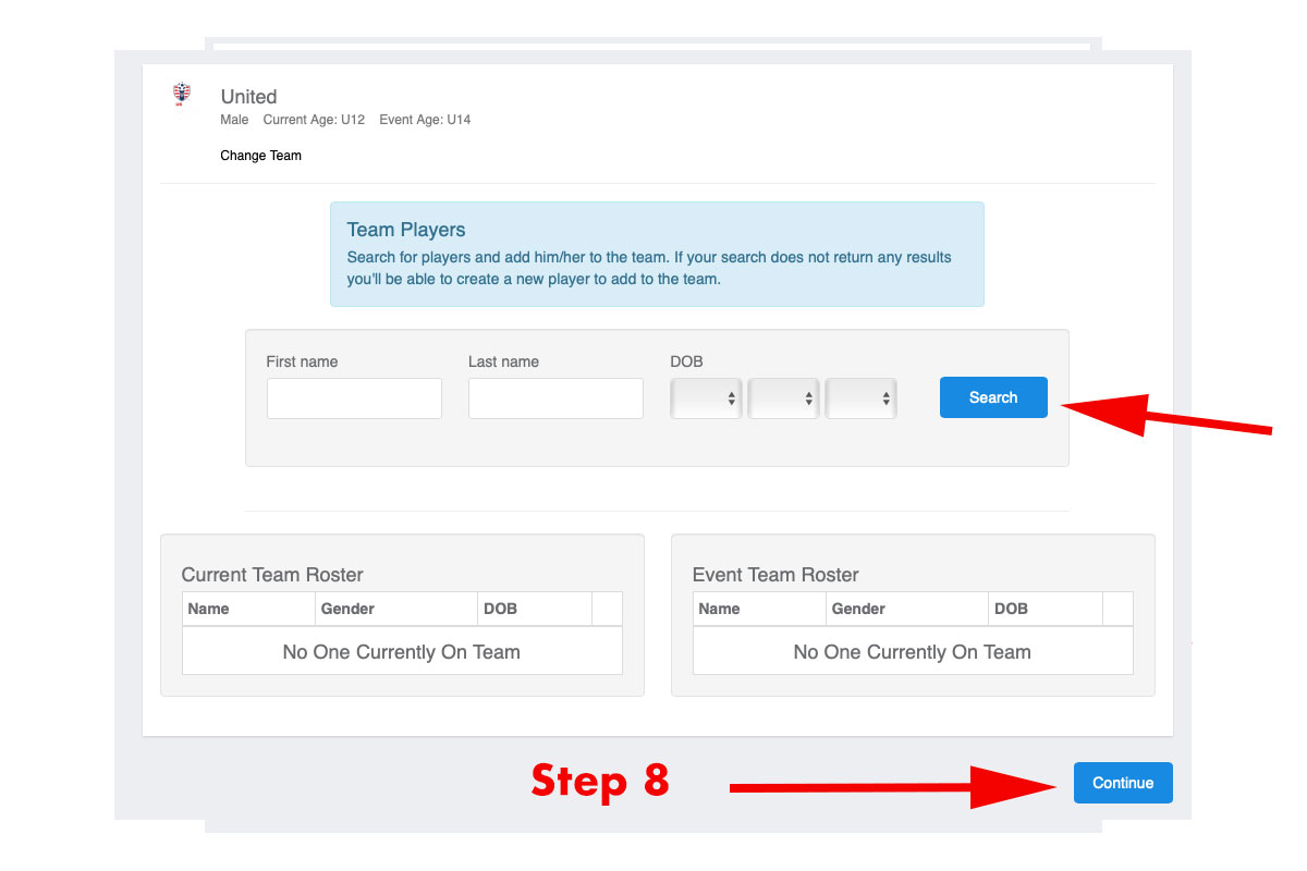 Each player on your team will need to have a gotsport account. You can search them by First Name, Last name and Date of Birth. You don’t need to add them now, you can skip this by clinking continue. You will need to complete your roster for the credentials check.